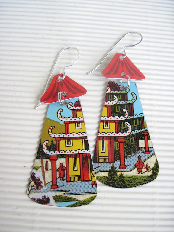 I saw some earrings on a woman in an airport this week and loved the shape and the way they moved. I took the idea and created some from tin when I got home. Not the same, but my spin on it. The tin came from an tea tin which I think was British although each side had a different image from various tea growing areas in the world.